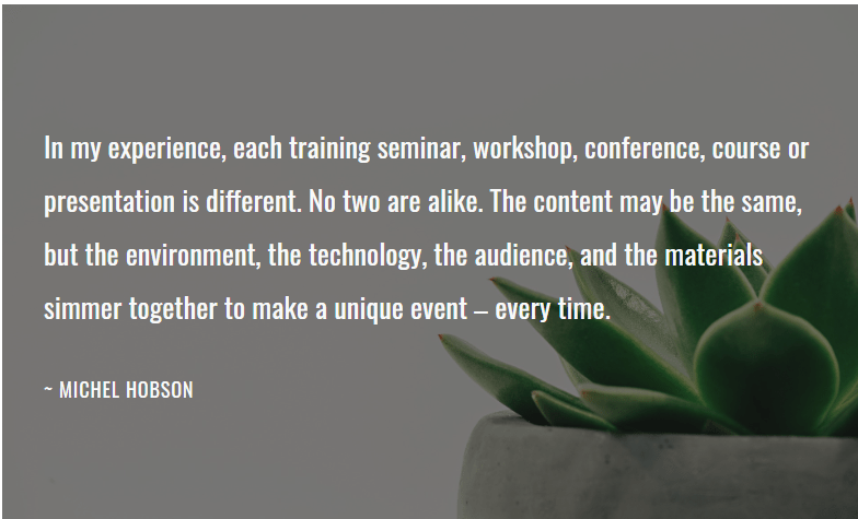 In my experience, each training seminar, workshop, conference, course or presentation is different. No two happen are alike.