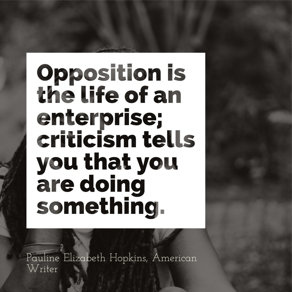 Opposition is the life of an enterprise; criticism tells you that you are doing something. ~ Pauline Elizabeth Hopkins Spread the News!Tweet Click to email a link to a friend (Opens in new window) Email Related