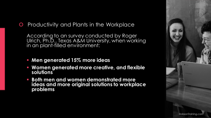 According to an survey conducted by Roger Ulrich, Ph.D., Texas A&M University, when working in an plant-filled environment:
